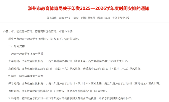 根据滁州市教育体育局此前发布的2025—2026学年度时间安排的通知: