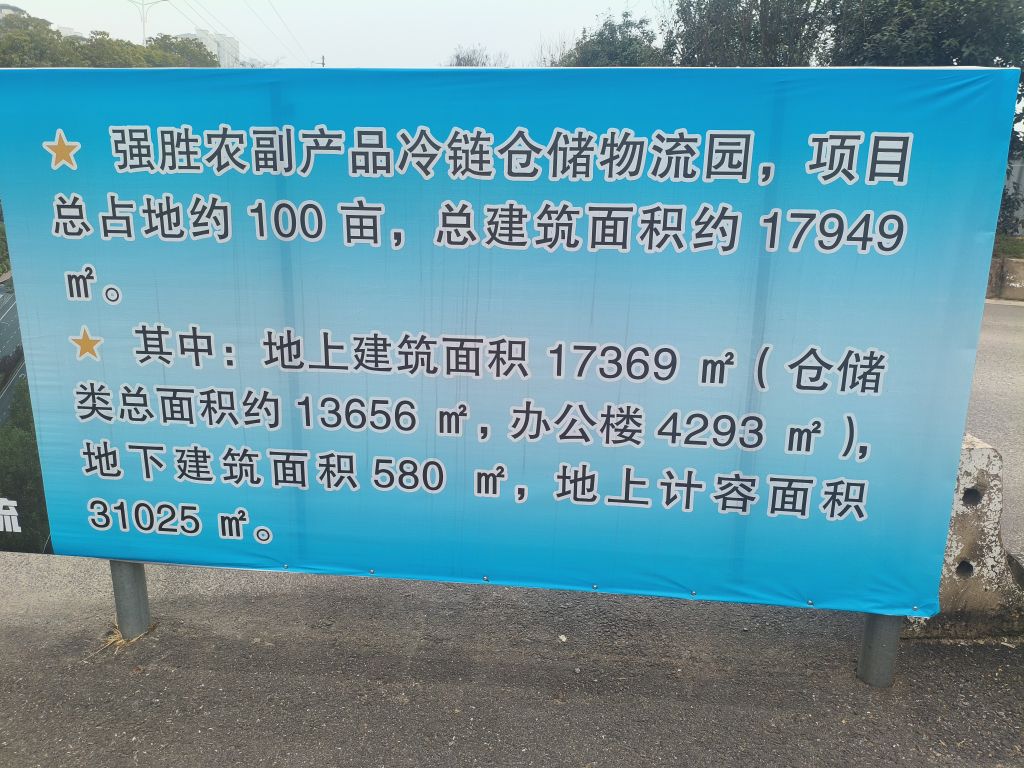特大好消息!滁州人有福啦! 惠民菜场原百货区、小狗市区停车场区域,将新建强胜农副产品冷链仓储物流园! 项目总占地约100亩,总建筑面积17949㎡: - 地上建筑面积:17369㎡- 仓储类:13656㎡- 办公楼:4293㎡- 地下建筑面积:580㎡- 地上计容面积:31025㎡ 滁州终于有大型冷库啦!以后冷冻产品不用再去合肥、南京中转,成本大大降低,新鲜又实惠,滁州市民真正享受到民生福利!